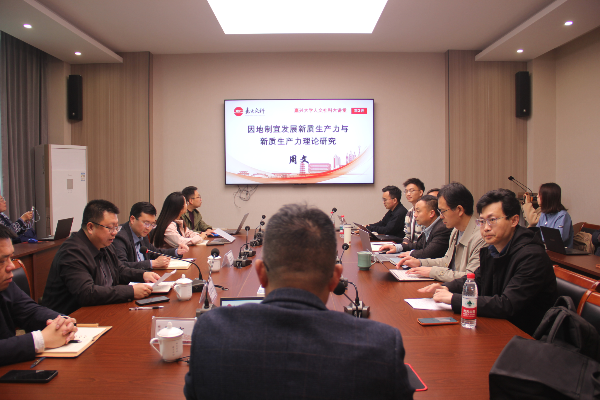 2026年4月22日下午,嘉兴大学人文社科大讲堂第3讲在厚德楼350会议室顺利举行。教育部“长江学者”特聘教授、复旦大学马克思主义经济学中国化研究院周文教授应邀做题为《因地制宜发展新质生产力与新质生产力理论研究》专题学术报告。文雁兵副校长出席并致辞,人文社科处处长彭冰冰主持本次活动,小黄书 、经济小黄书师生代表到场聆听交流。